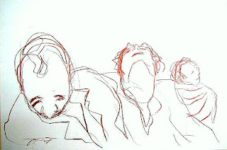 "In the beginning was the black wall, and the wall was wider, and the artist had to scale the scaffold in front of the wall. With him was the waste papers and this papers was the light that formed a large face of men. “The Light shines in the darkness and the darkness did not overcome it”.